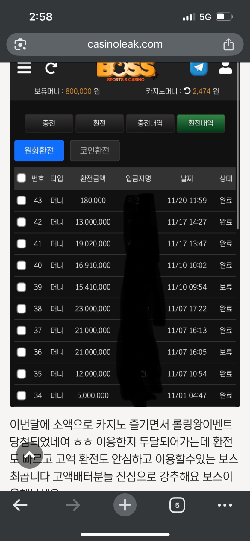 이번달에 소액으로 카지노 즐기면서 롤링왕이벤트 당첨되었네여 ㅎㅎ 이용한지 두달되어가는데 환전도 빠르고 고액 환전도 안심하고 이용할수있는 보스 최곱니다 고액배터분들 진심으로 강추해요 보스이용해보세요