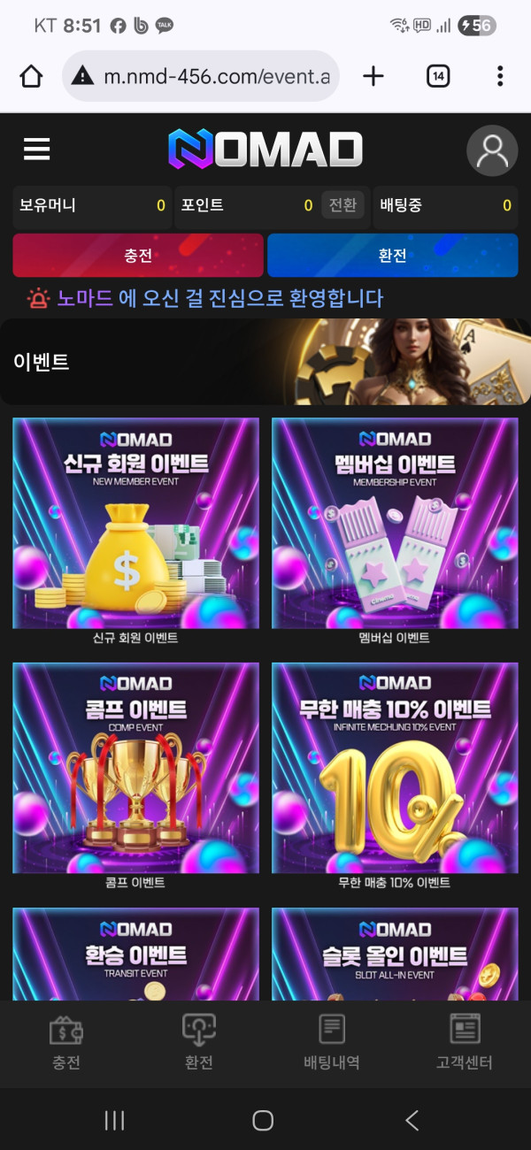 제가 믿고 쓰는 사이트 노마드는 이벤트도 정말 많고 유저들에게 더 많은 혜택을 제공해주며 스포츠 종목도 다양하고 해외형 배팅 기준점이 많으면서 배당도 높습니다. 미니게임도 다양한 게임 있습니다.