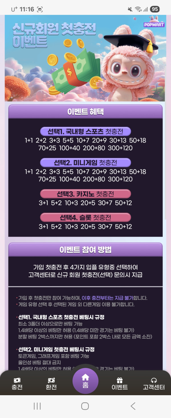신규첫충도 개이득입니다ㅎㅎ그리고 이벤트가20가지가 넘어요ㅎㅎ참여할수있는 이벤트가정말많죠 기회되신다면 같이즐기셧으면좋겠습니다