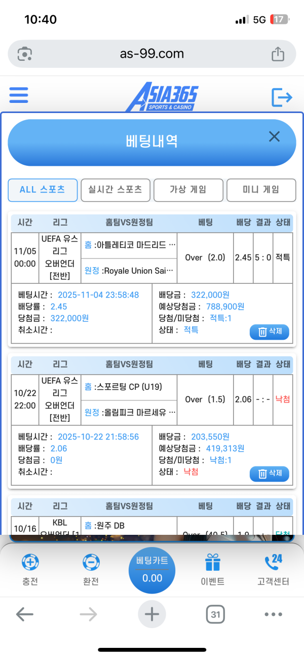 아시아365는 먼저 베팅하기 깔끔한 곳이고 충환전 전부 빠른곳입니다