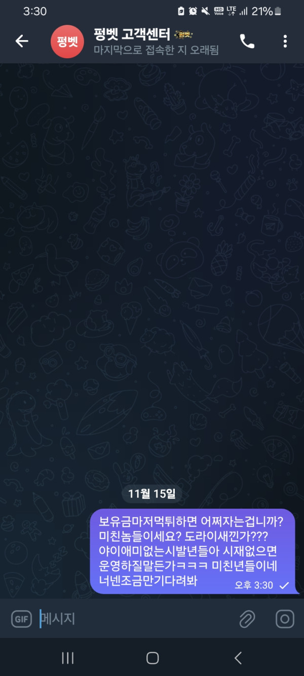 펑벳 절대이용하지마세요 지금 여러텔레방에서도그렇고 시제 떨어져서 회원들환전신청하면 환전취소부터시작해서 미니게임추가롤링도아닌 스포츠 추가롤링 500~1000프로 채워라는 미친놈들입니다 현재 사이트 문의글도 막아놓은상태이구요 입플이벤트 3+3 10+5 등등 되있는데 막상 가입하면 이상한핑계대면서 블랙이라는이유로 입플적용안되고 반박하는글쓰면 고센차단부터해서 텔레그램차단까지하는미친놈들입니다 절대 이용하지마세요 현재 모든 보증제휴 다 손절한상태고 사이트자체도 기존 먹튀사이트에서 펑이라는 이름으로 리뉴얼한겁니다 진짜 이용했다가 인생 펑 되고 좆됩니다 이새끼들 인간새끼들아니니깐 절대 이용하지마세요절대! 그냥 1~5만원까지는 환전해줄지몰라도 그 이상 환전버튼없는곳입니다 인간적인대화도안되는새끼들이고 갱생안되는새끼들이니 절대 이용해지마시길바랍니다